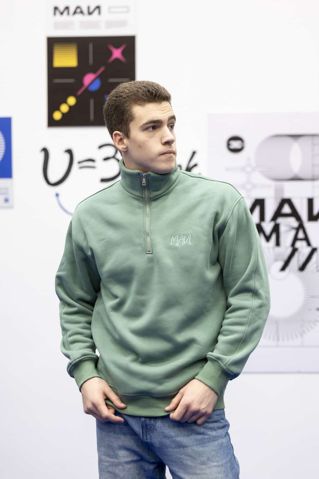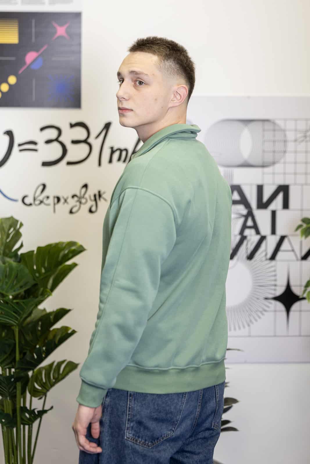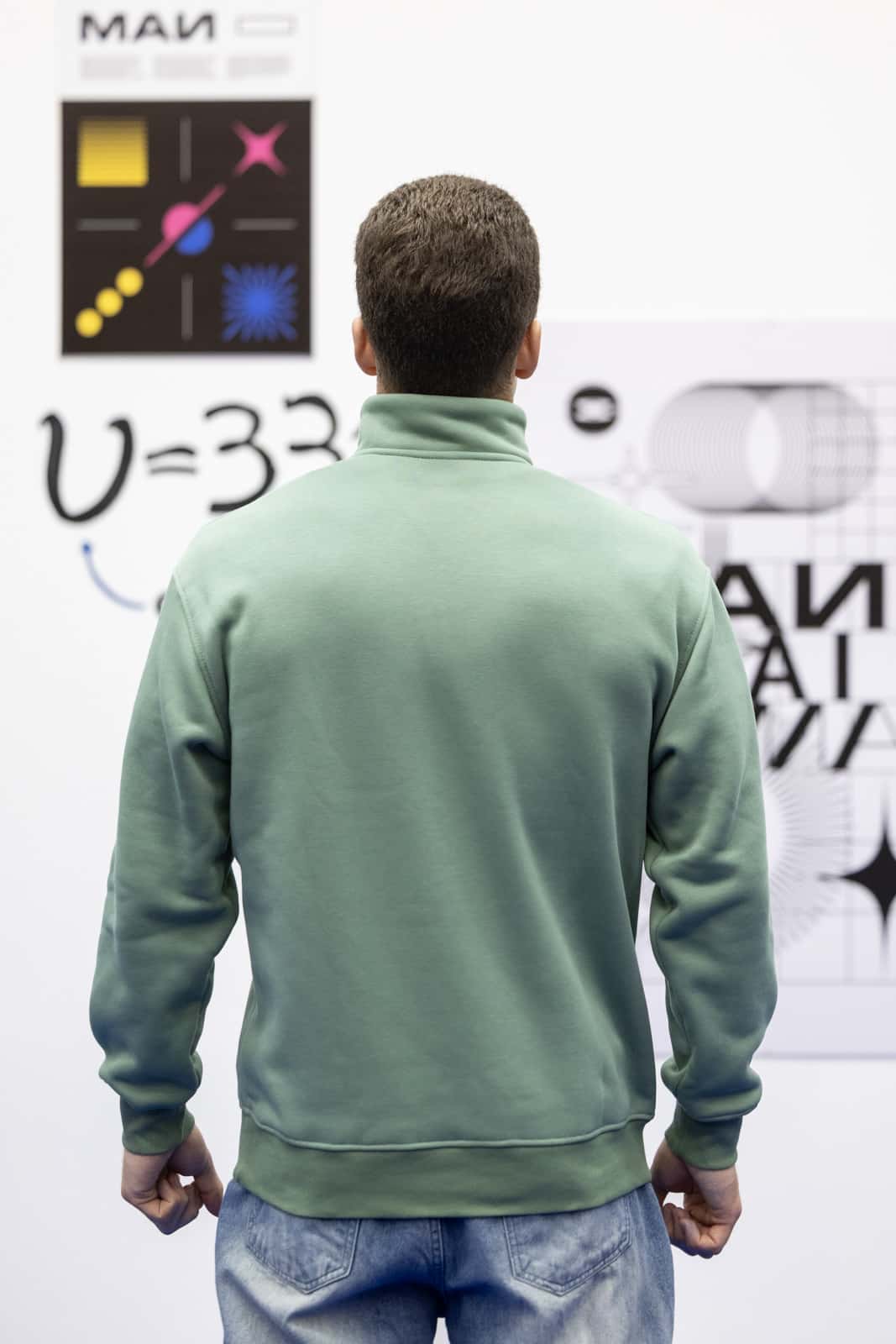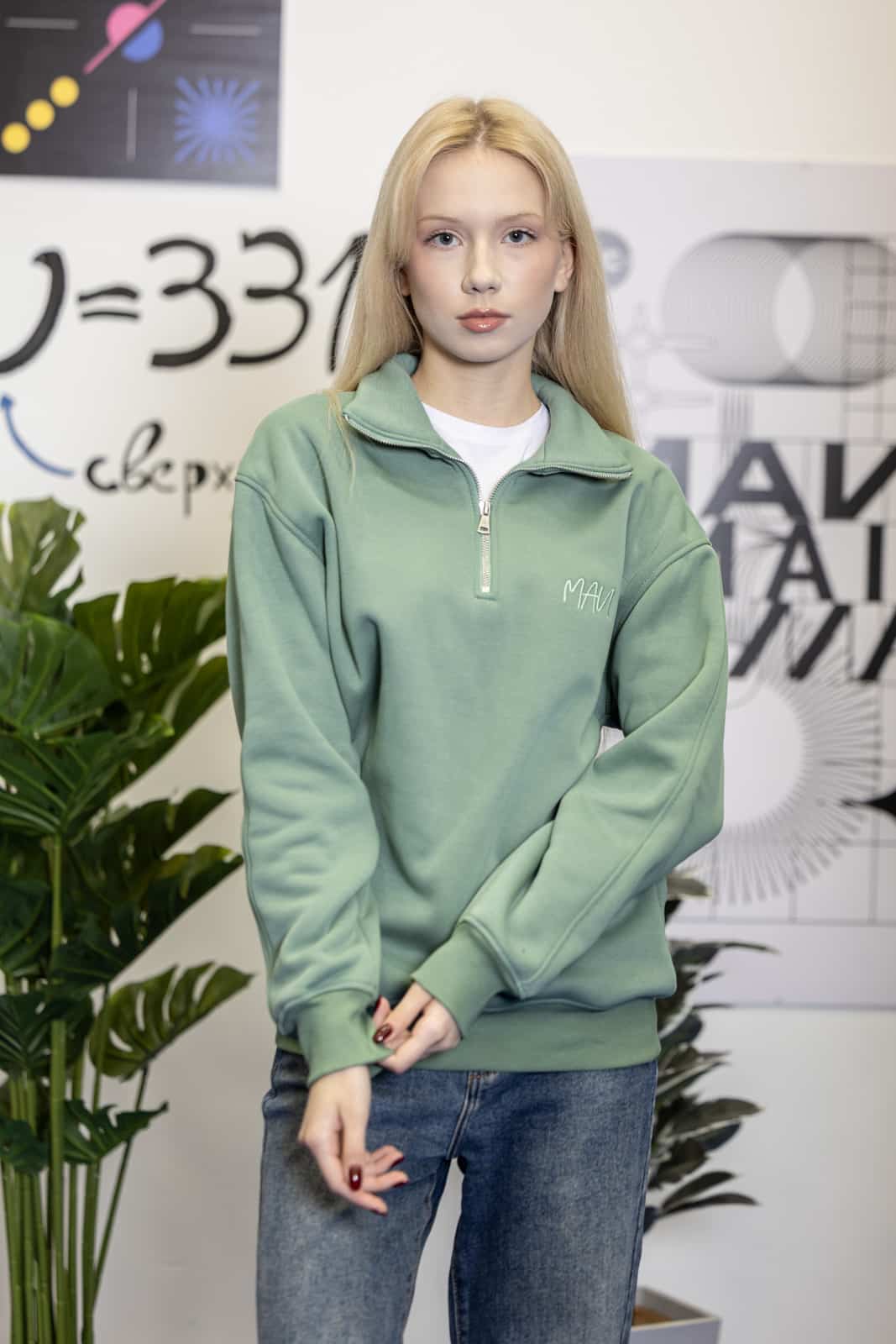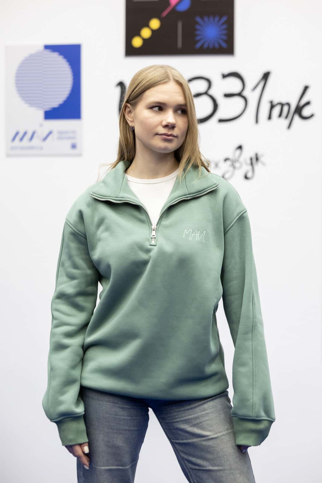 Стильная и удобная толстовка из коллекции «Новое поколение» в эффектном мятном оттенке. Модель на молнии 25 см, воротник стойка, на пуллере гравировка логотипа МАИ.